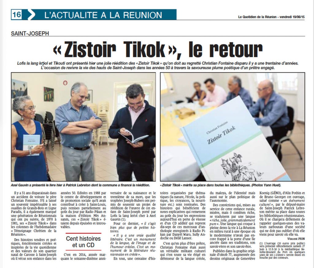 Nou la déza di in kou ke tout zistoir ki ariv an Frans, domoun i mèt sa si lo kont « Toto » osinonsa « Marius et Olive ». Tandik isi, la Rénion, i di sé « Tizan » osinonsa « Tatav Tikoute » lotèr ! Pouatan, souvandéfoi, sé Tikok lo « z’héros » d lo zistoir ! Amoink tout bann zistoir la lé mantèr ; danskala sa i fé parti « le patrimoine universel » ! Lo pti morso ke ni sa rakonté zordi si « La Bastille » stin nafèr konmsa minm, byin sir !
